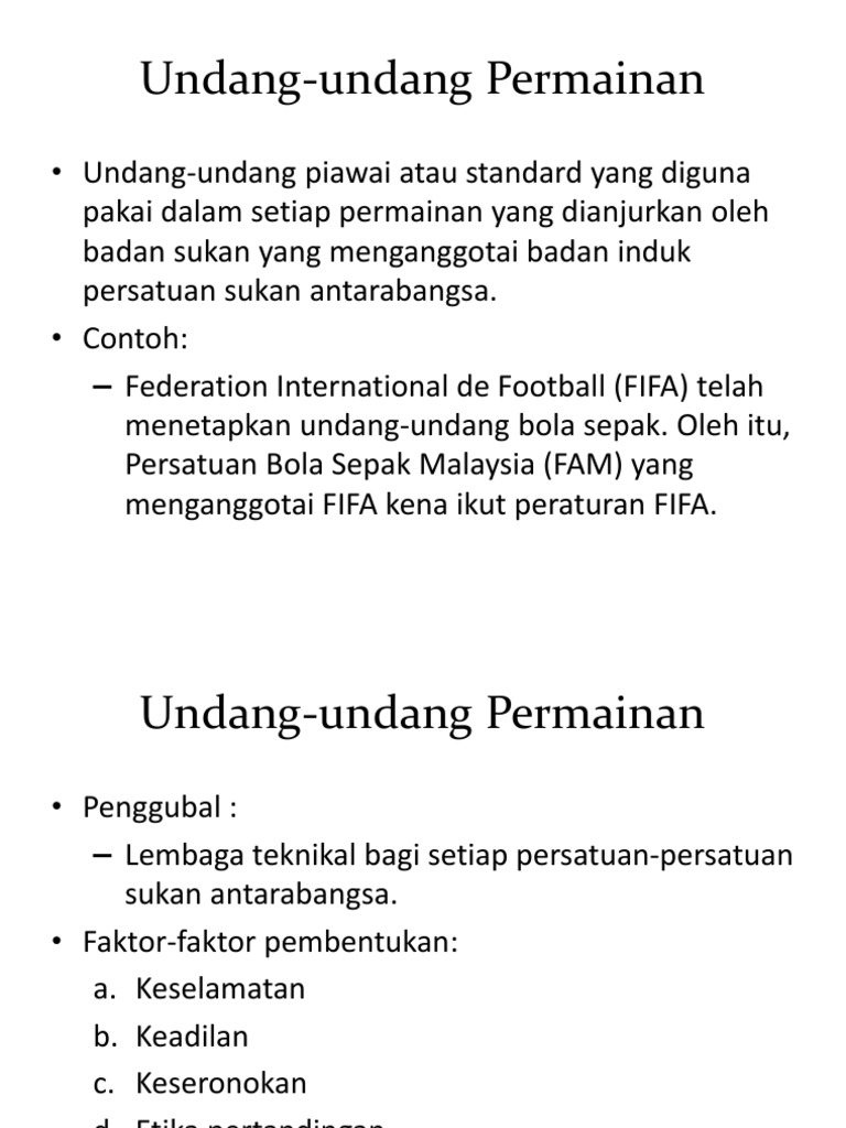 BAB 3 LATAR BELAKANG SUKAN BOLA SEPAK 31 Sejarah Dan Perkembangan 17 32 Peraturan Dan Undang-Undang Permainan 20 33 Pengelolaan KejohananSistem Pertandingan 49 BAB 4 PERSEDIAAN DAN PERANCANGAN 41 Pertimbangan Untuk Latihan 53 42 Contoh 1 Sesi Latihan 55 43 Aktiviti Memanaskan Badan 57 44 Aktiviti Gerak Kendur 57. Undang-Undang Nomor 3 Tahun 2005 tentang Sistem Keolahragaan Nasional. Sebagai contoh jika anda menjaringkan gol dan membuka baju untuk meraikannya lalu VAR mengesahkan bahawa gol anda tidak sah maka kad kuning disebabkan oleh meraikan gol dengan cara yang tidak dibenarkan akan tetap diterima.